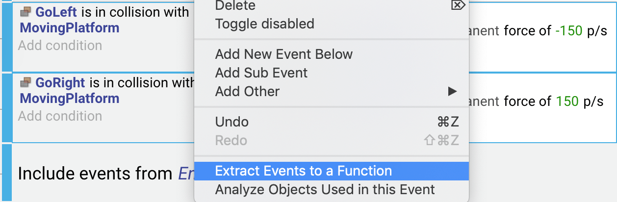 GDevelop analyzes the selected events and sub-events, will extract them in a function and will display a window to allow you to customize this function. After you've filled the fields, click on Create to have the function created and the selected events replaced by a call to the function.