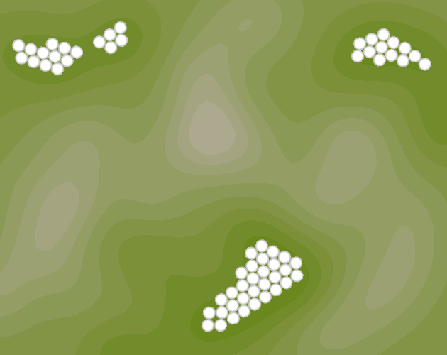 One scalar field can be used for the lower bound and another the upper bounds. They will define a range of value for every point of the surface and the noise will be stretched in between. They can be built with hills like in the following illustration to give the general shape of the island.