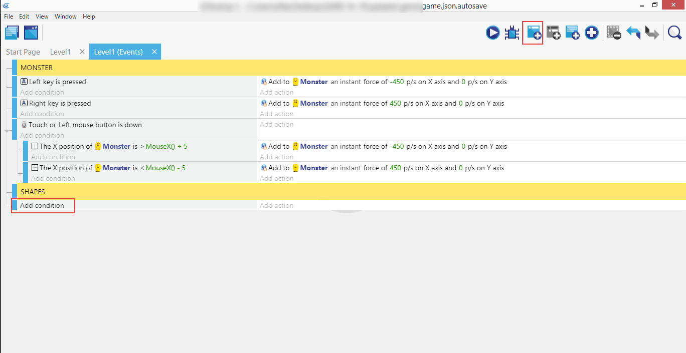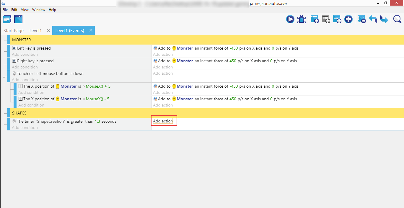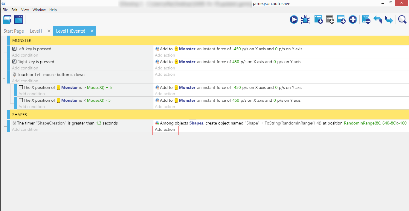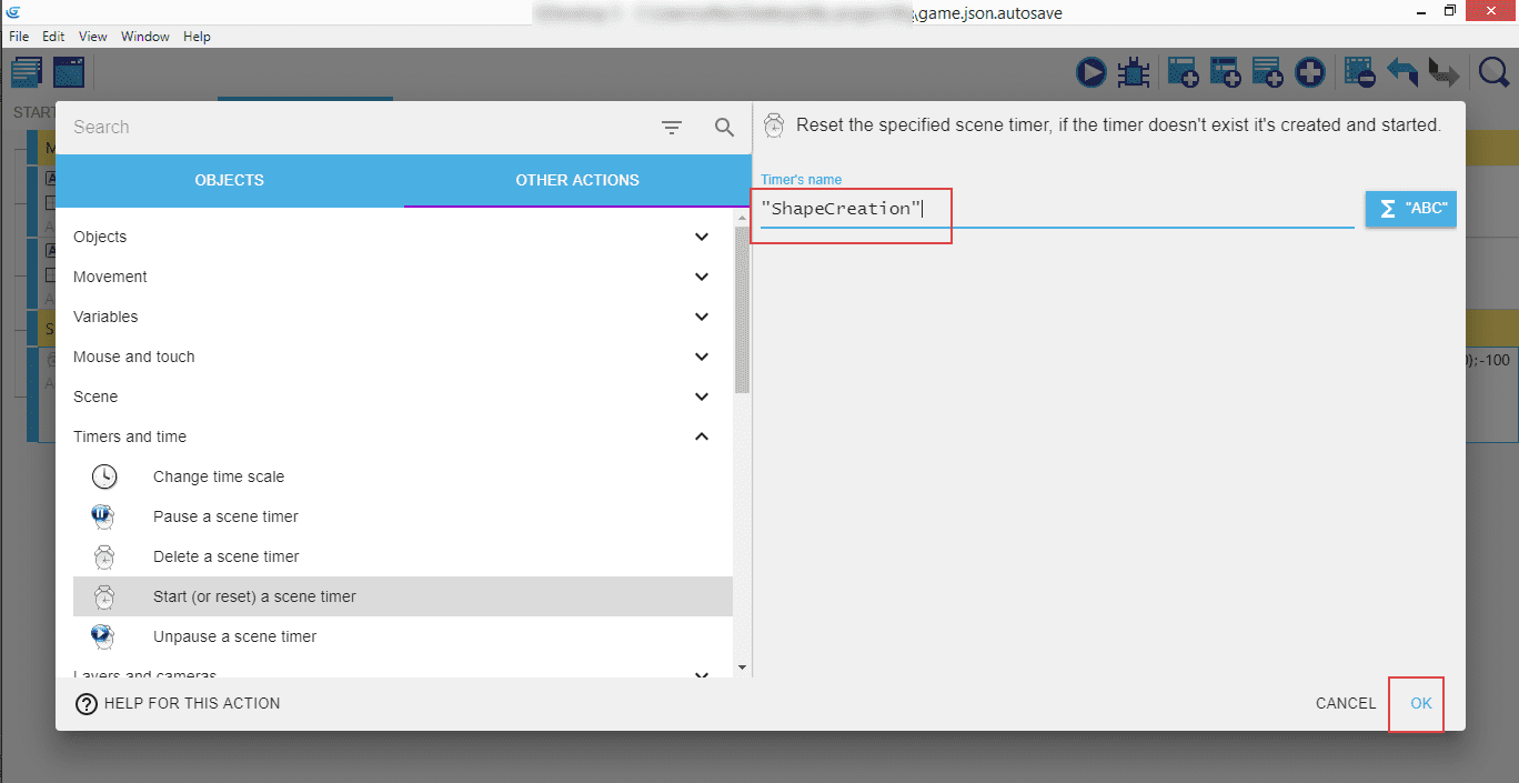 Next create a new event above the shapes event and give it the condition "at beginning of the scene", and copy/paste the earlier create "Start (or reset) a scene timer" action for "ShapeCreation" to this new event. This will start the timer at the beginning of the game in so the shapes event will trigger the first time.