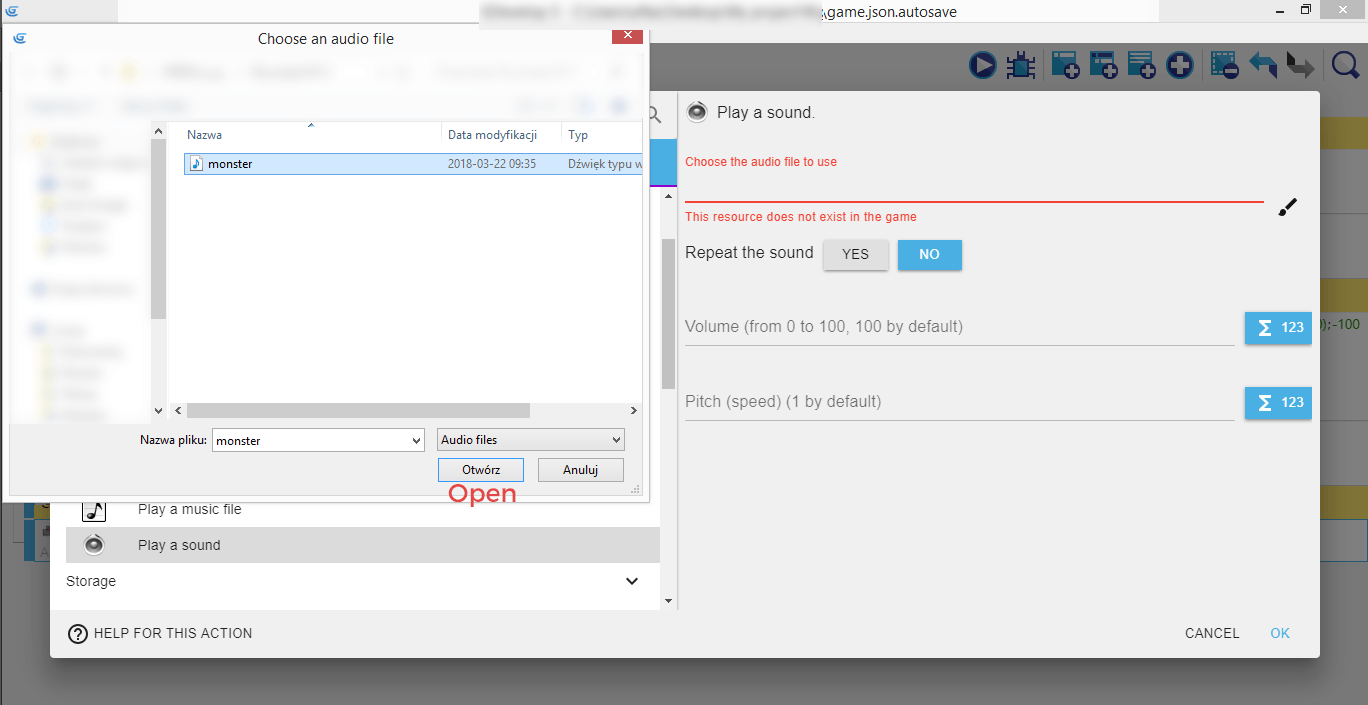 It will open a popup where you'll be able to choose and load an audio file that will be played when the shape will be collected by the Monster. For us, it's called monster.wav.