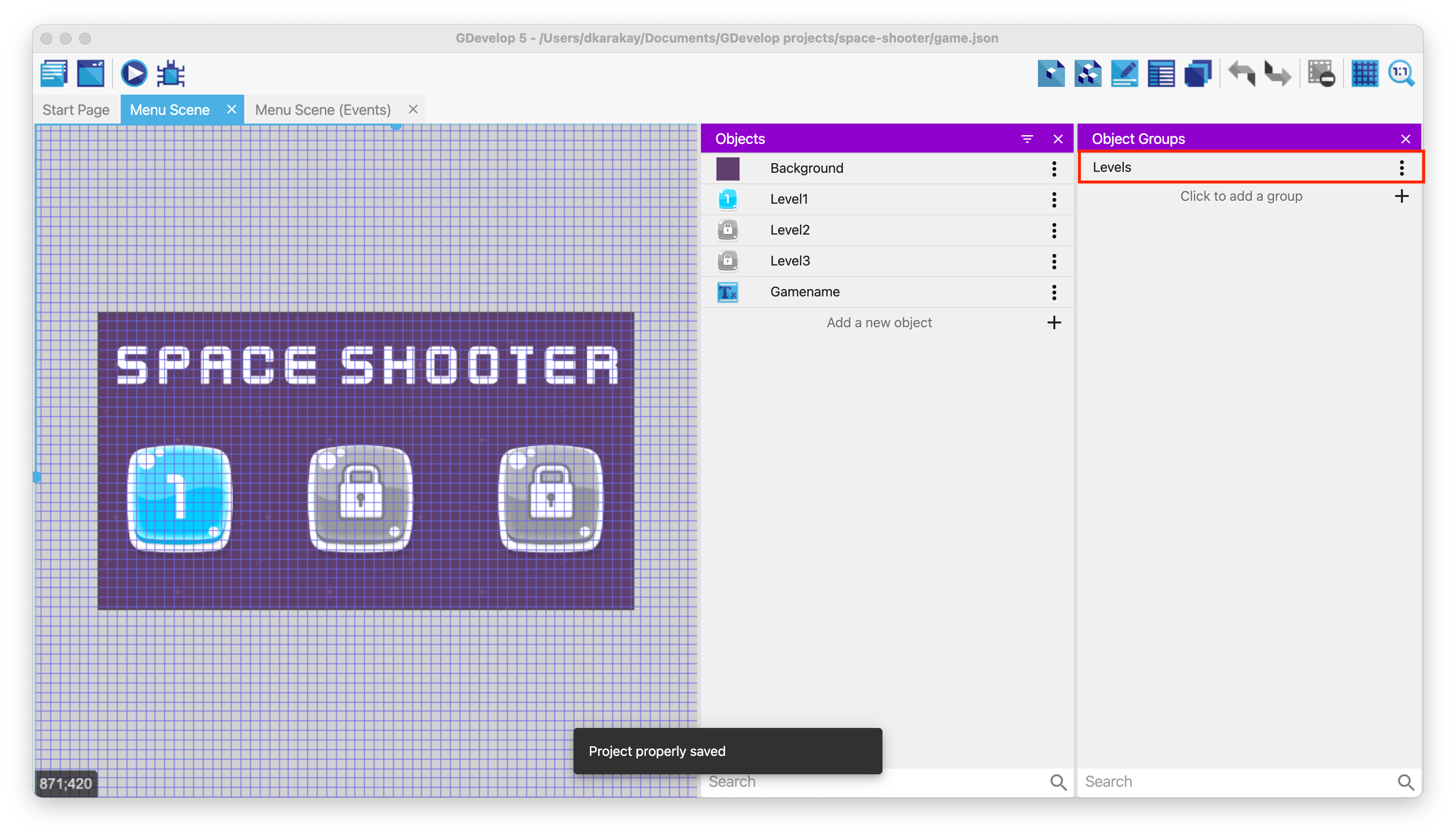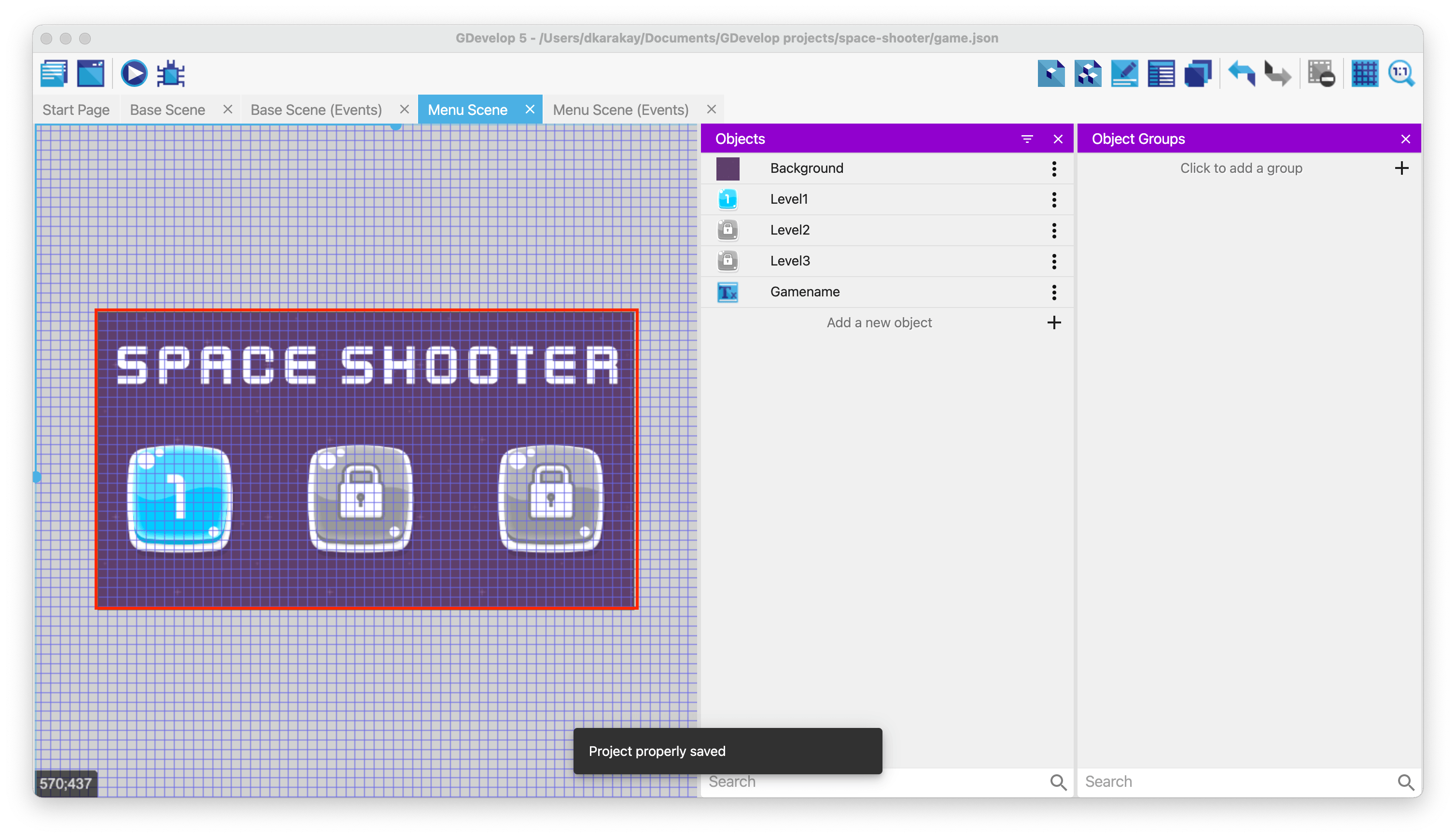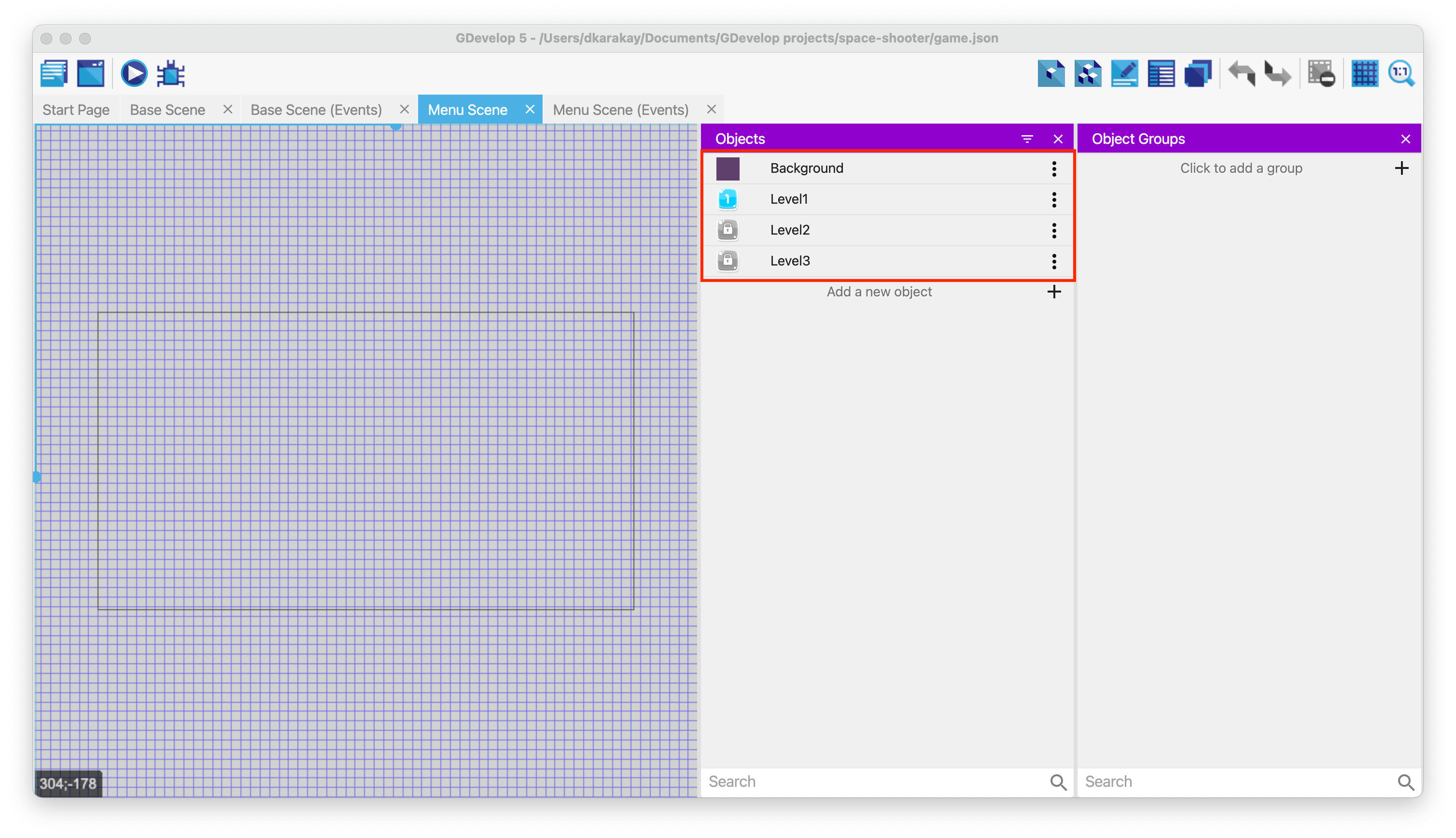 Repeat the last process to add Level3. Then, copy the Background object from Base Scene, as we did in chapter 11 to create explosion effects. In the end, your objects should look like this: