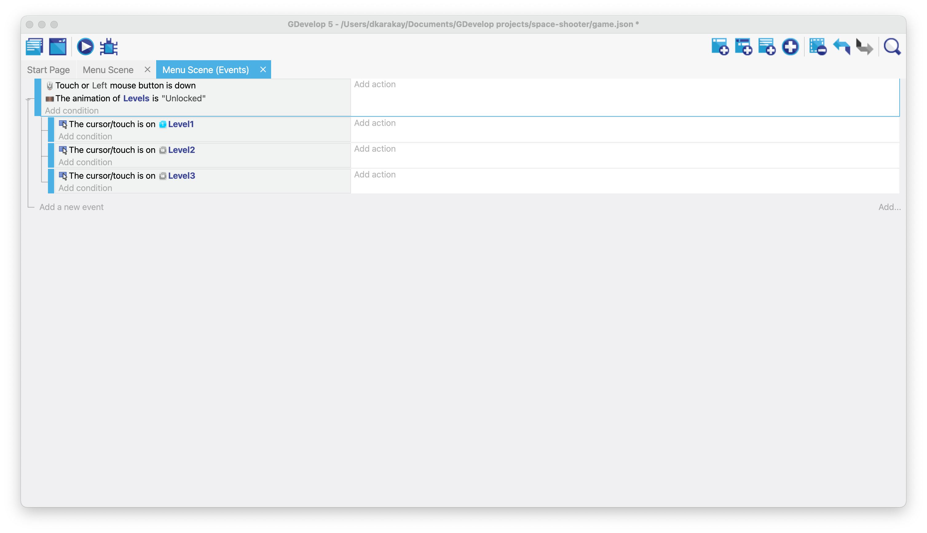 Create a new global variable called "LevelSelection" and set its initial value to 1. Then, change this variable to open the specific level (e.g., change it to 2 to load Level 2). Then add an action to run Base Scene. In the end, your events should look like this: