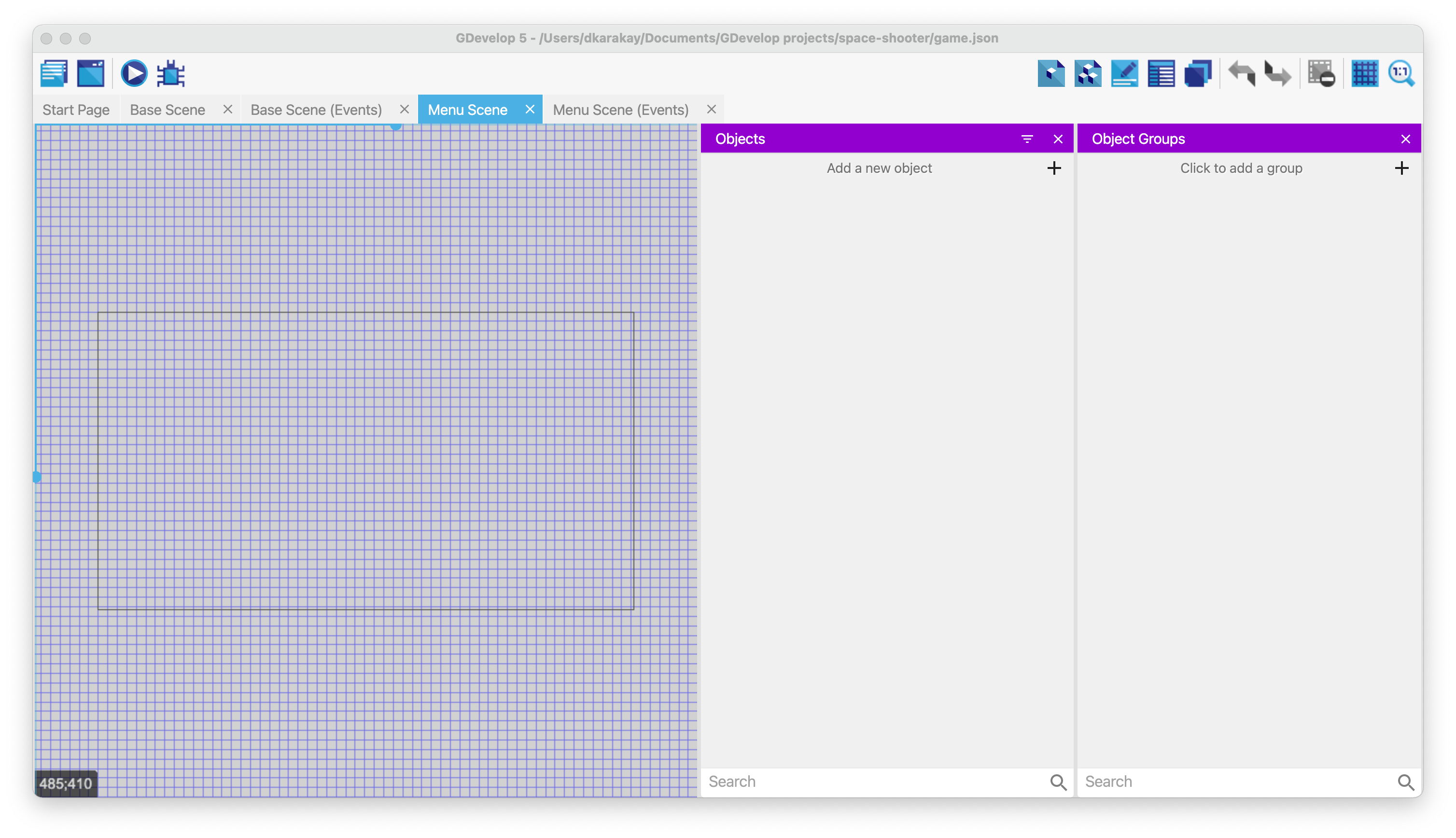 Open the project manager from the upper right corner, and create a new scene called Main Menu.